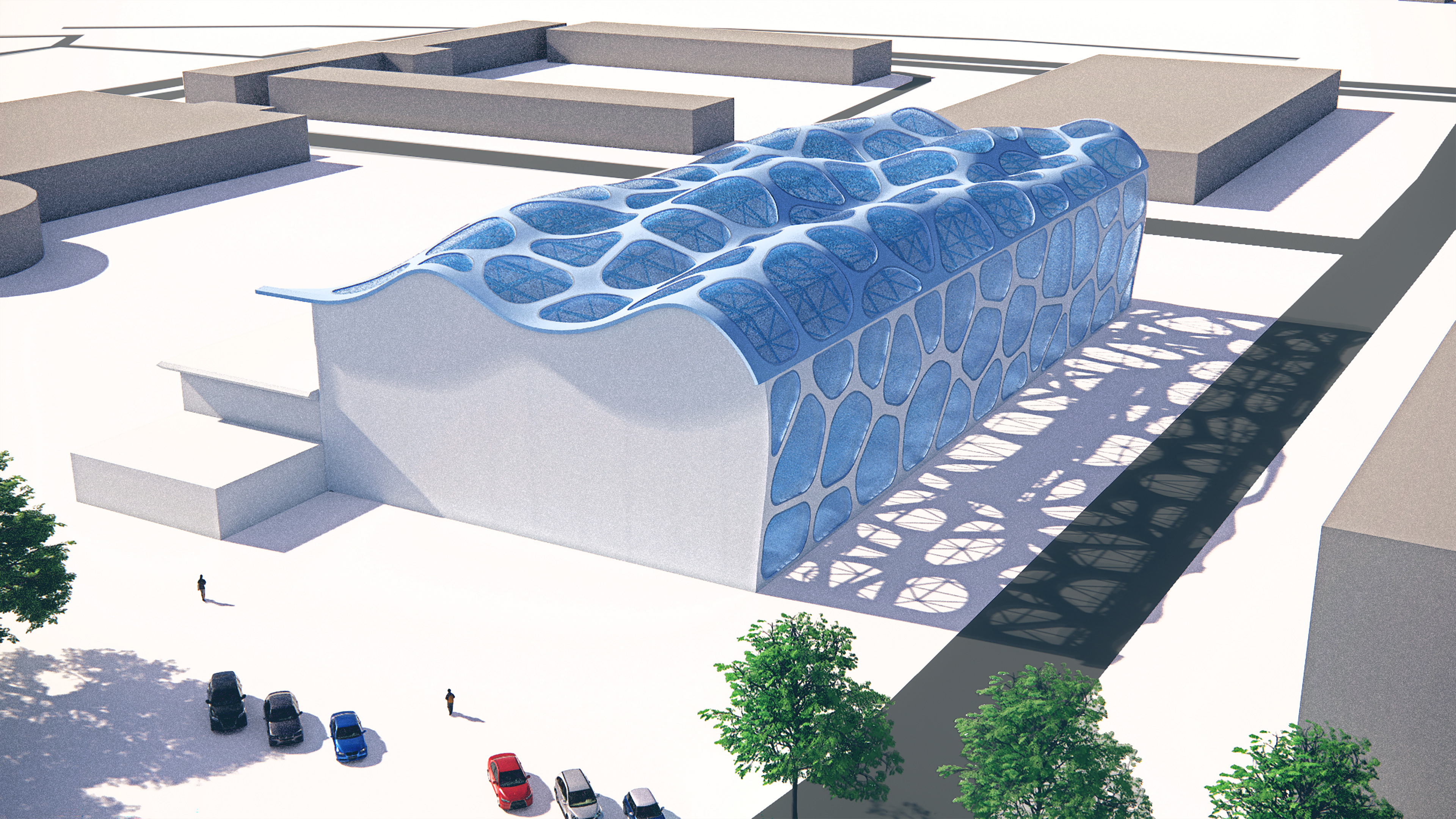 The building’s structural methodology draws inspiration from Zaha Hadid’s London Aquatics Centre and its hybrid form-active shell and vector-active space frame systems. Using a form-active shell system establishes the wave-like geometry, allowing loads to be distributed throughout the curved form while maintaining its fluid character. Underneath the shell system, a lightweight, robust vector-active space frame system acts as a secondary structural element to the building. This hybrid system proved to be the ideal method for achieving this concept.