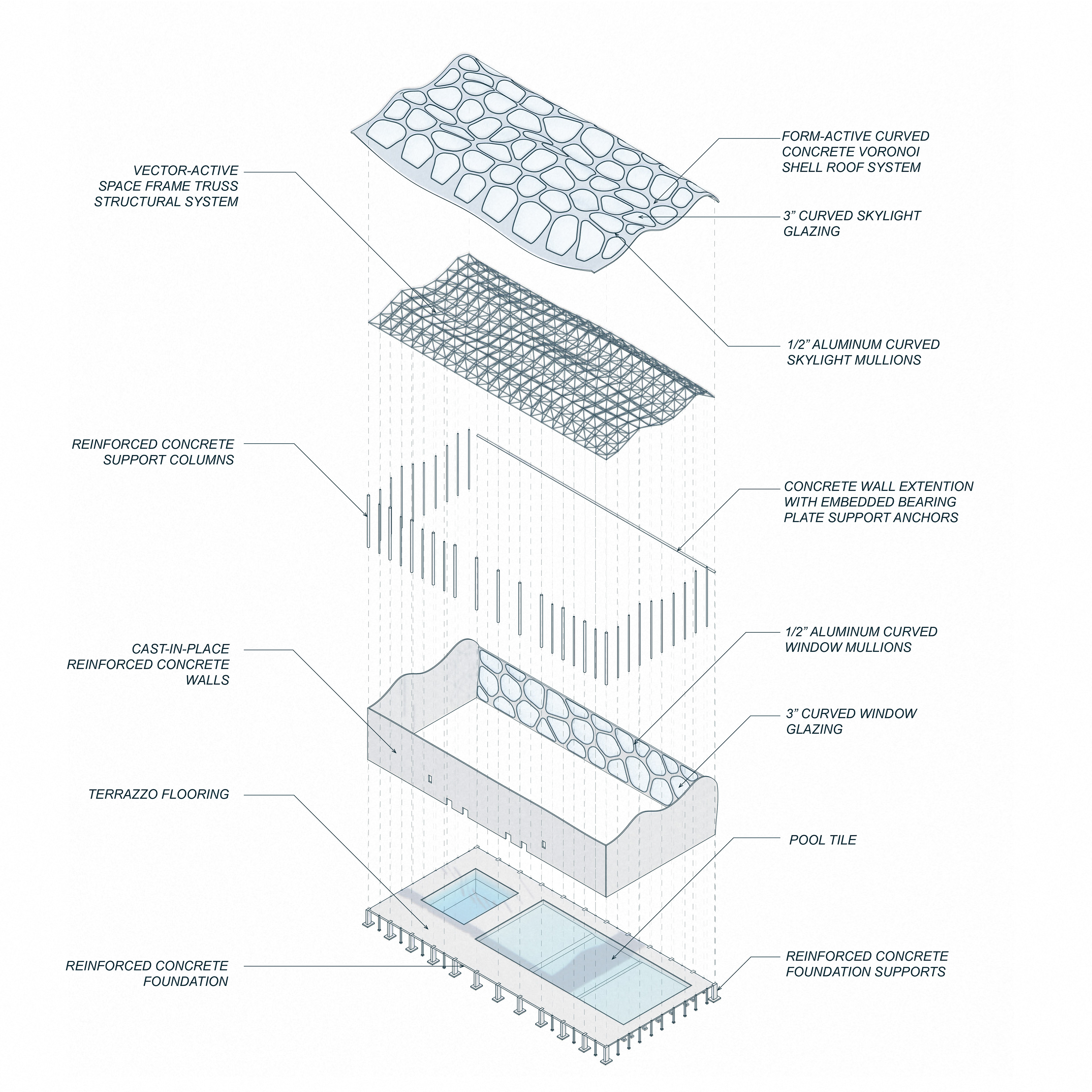 An exploded axonometric diagram was created to illustrate the connection between the hybrid vector- and form-active structural systems in this aquatic center's design. A combination of column supports and steel bearing plate anchors extending from the curved Voronoi wall acted as the new supports for this re-envisioned structure. Voronoi openings defined locations where blue frosted glass could be installed for reflecting underwater light imagery.